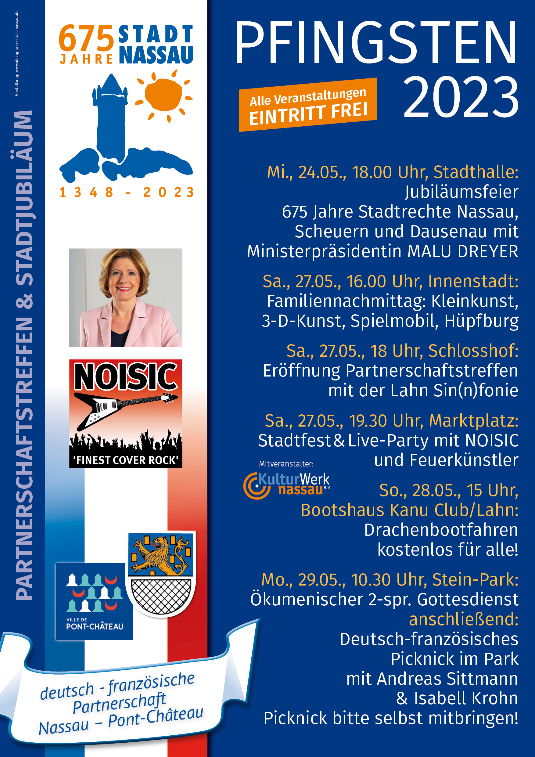 Impressionen des wunderbaren Pfingstwochenendes mit der 675-Jahr-Feier der Stadt Nassau und dem Partnerschaftstreffen mit unseren Freunden aus Pont-Château sind hier zu finden: facebook.