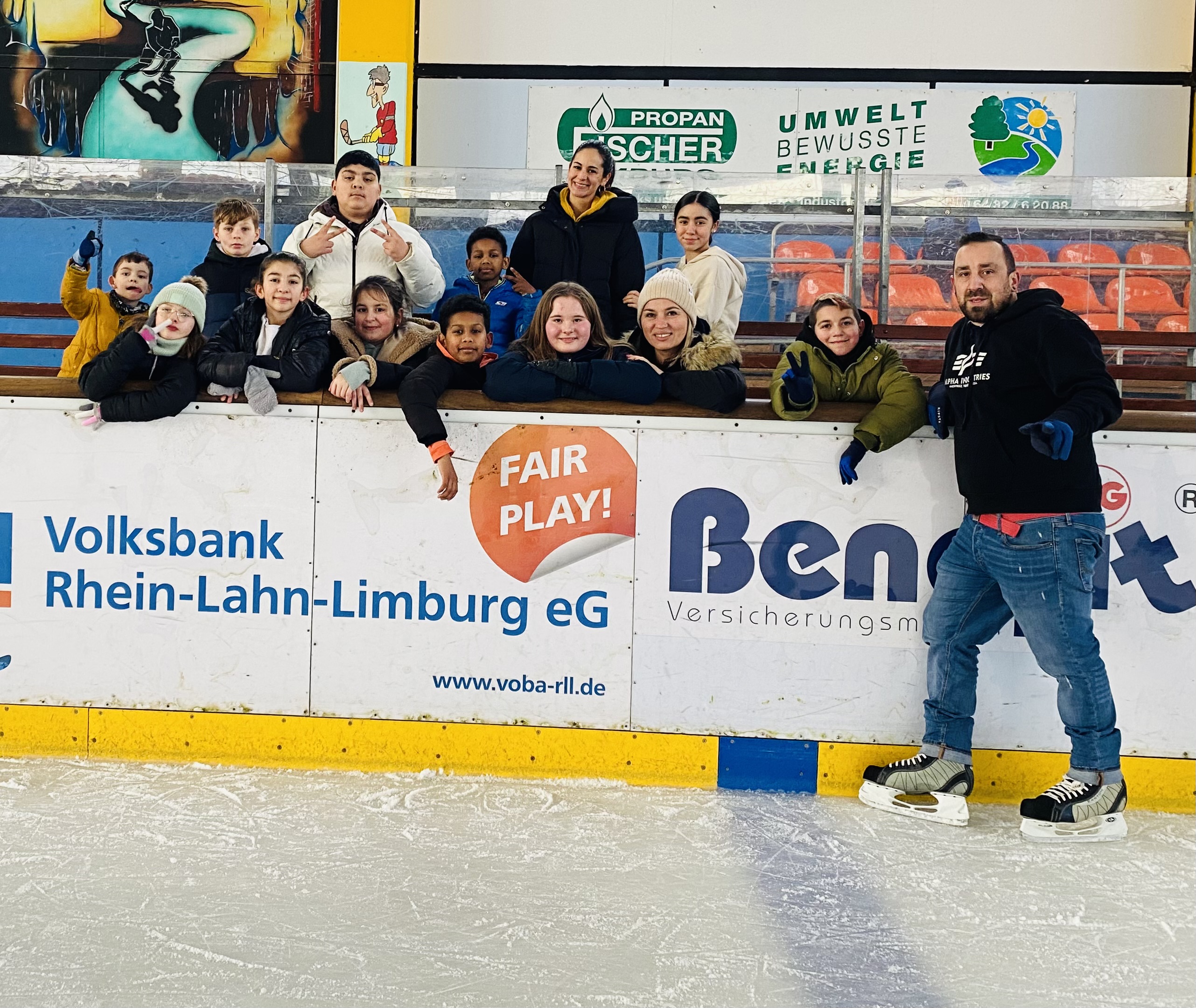 Zum Abschluss der Karnevalstage ging es in die Eishalle nach Neuwied. Dort machten viele der Jugendlichen zum ersten Mal Erfahrungen mit dem Schlittschuhlaufen. Entsprechend wackelig waren sie zu Beginn auf den Beinen. Doch nach ersten Startschwierigkeiten gelang es allen mit mehr oder weniger Hilfe ihre Runden auf dem Eis zu drehen.
