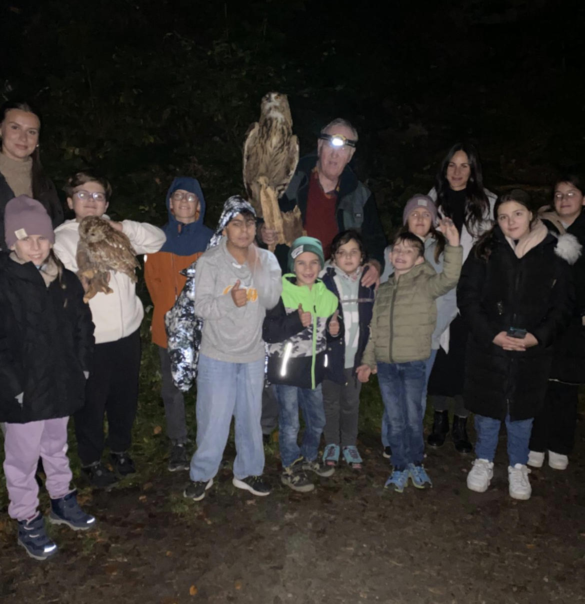 Herr Braun vermittelte spielerisch Informationen über den Waldkauz, wie dessen Ernährung, Nistgewohnheiten und Lebensraum. Um die nachtaktive Eule hören zu können wurden verschiedene Lockrufe ausprobiert. Als tatsächlich ein echter Waldkauz auf die Rufe antwortete und sogar näher kam, waren alle begeistert. Die Gruppe konnte den Vogel im Scheinwerflicht beobachten und wurde so für ihre Geduld belohnt.