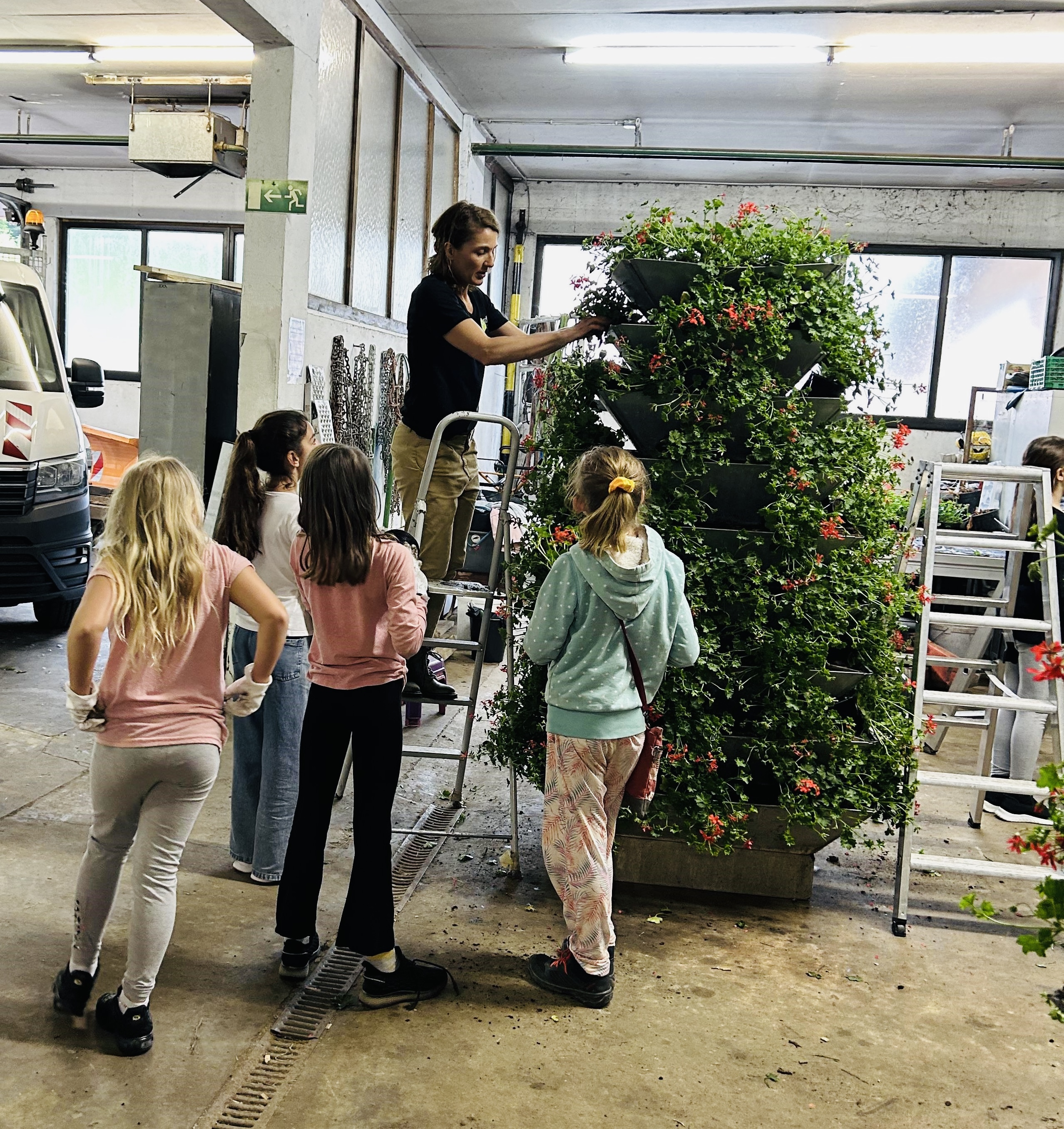 Vierhundert Geranien harrten im Bauhof aus, um in die vorbereiteten vier Pflanzpyramiden eingesetzt zu werden. Unter fachmännischer Anleitung von Maike Proff und ihrem Auszubildenden lernten die Teilnehmenden schnell, wie mit den zarten Pflanzen umgegangen werden muss. Nach nur zwei Stunden hatte jede Blume ihren Platz gefunden, war gedüngt und angegossen. Die Teilnehmenden waren selbst überrascht, wie gut und schnell die Aktion abgeschlossen werden konnte. Nun freuen sie sich, „ihre“ Pflanzen in der Stadt beim Wachsen und Gedeihen zu beobachten.