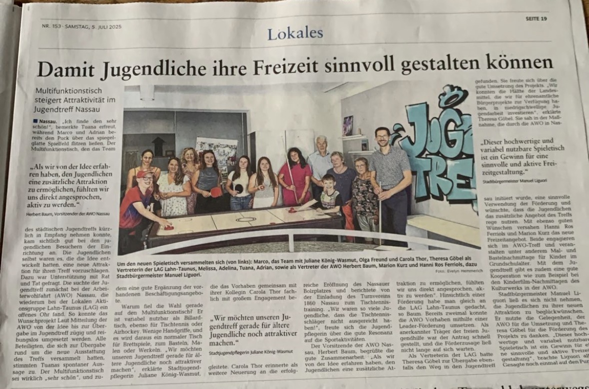 Über ein halbes Jahr hinweg durften Kinder und Jugendliche kostenlos am Tischtennistraining des TV 1860 Nassau teilnehmen. Der Verein bot ihnen die Möglichkeit, neue Fähigkeiten zu erlernen und Teil einer starken Sportgemeinschaft zu werden. Besonders im Winter war das Training ein Highlight und wurde gern angenommen, denn während im Jugendtreff nur wenig Platz vorhanden ist, bot die Trainingshalle genügend Raum für Bewegung und Spiel.